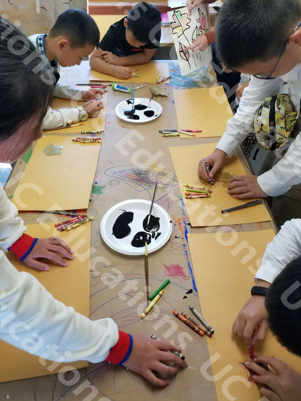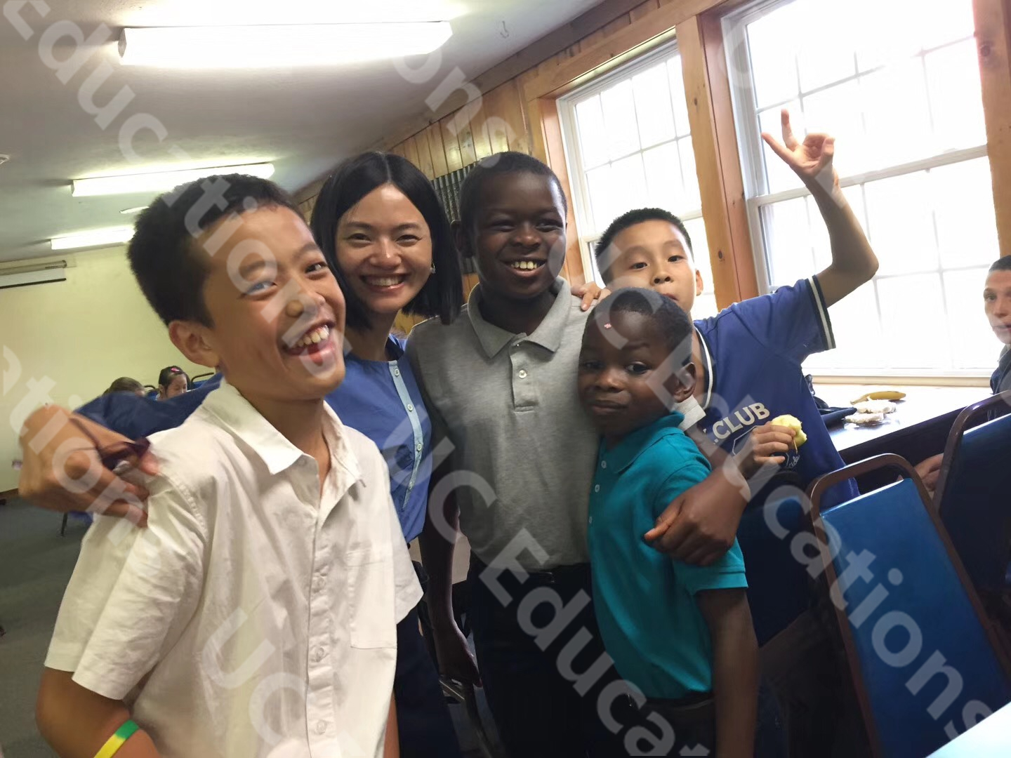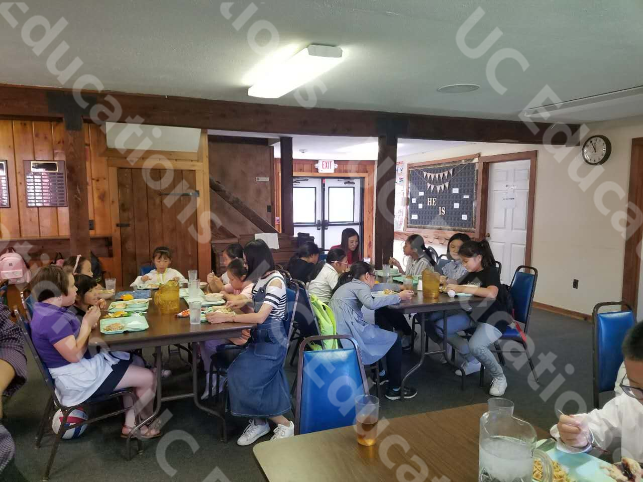 午餐时间,孩子们跟美国小朋友坐到一起,边吃边聊