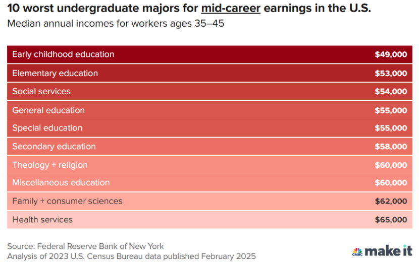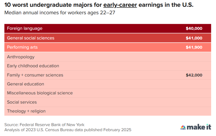 对比2024年数据来说,文科类专业依旧是偏弱势的群体。这组数据依旧来自纽约联邦储备银行的一项新分析。分析显示,主修教育、社会工作或艺术专业的毕业生,在毕业五年内的收入中位数往往是最低的。(该分析只涵盖拥有学士学位的全职工作人员,不包括仍在读的学生。)这与2024年的数据——文科、表演艺术和神学专业的学生在大学毕业后的五年内收入最低的结论并没有太大出入。